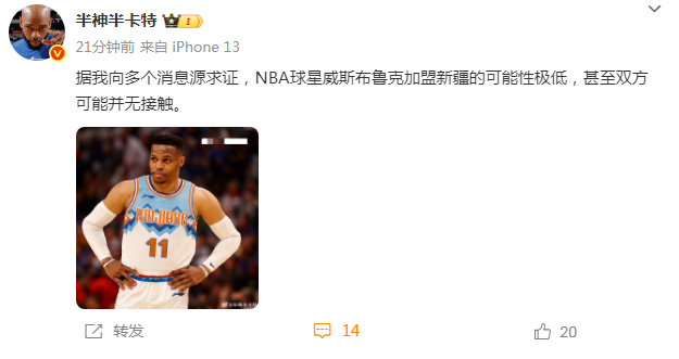 不过针对威少与新疆男篮的“绯闻”,媒体人半神半卡特报道:“据我向多个消息源求证,NBA球星威斯布鲁克加盟新疆男篮的可能性极低,甚至双方可能并无接触。”